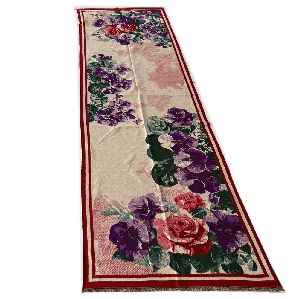 Adorned with a cascade of vivid flower blossoms of purple violets and rich crimson roses, framed by a bold crimson border, this shawl transforms any ensemble into a statement of timeless sophistication. Its generous drape allows it to be styled effortlessly—from a refined evening wrap to a chic daytime accessory.